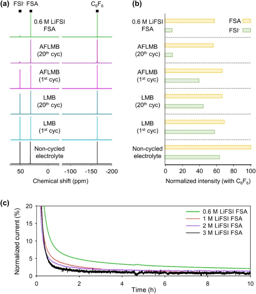 能夠優(yōu)先錨定在鋰金屬陽極上,形成相對穩(wěn)定的SEI,進(jìn)而減少了電解質(zhì)成分的寄生反應(yīng)(圖1b-d)。AFLMB中消耗的FSI