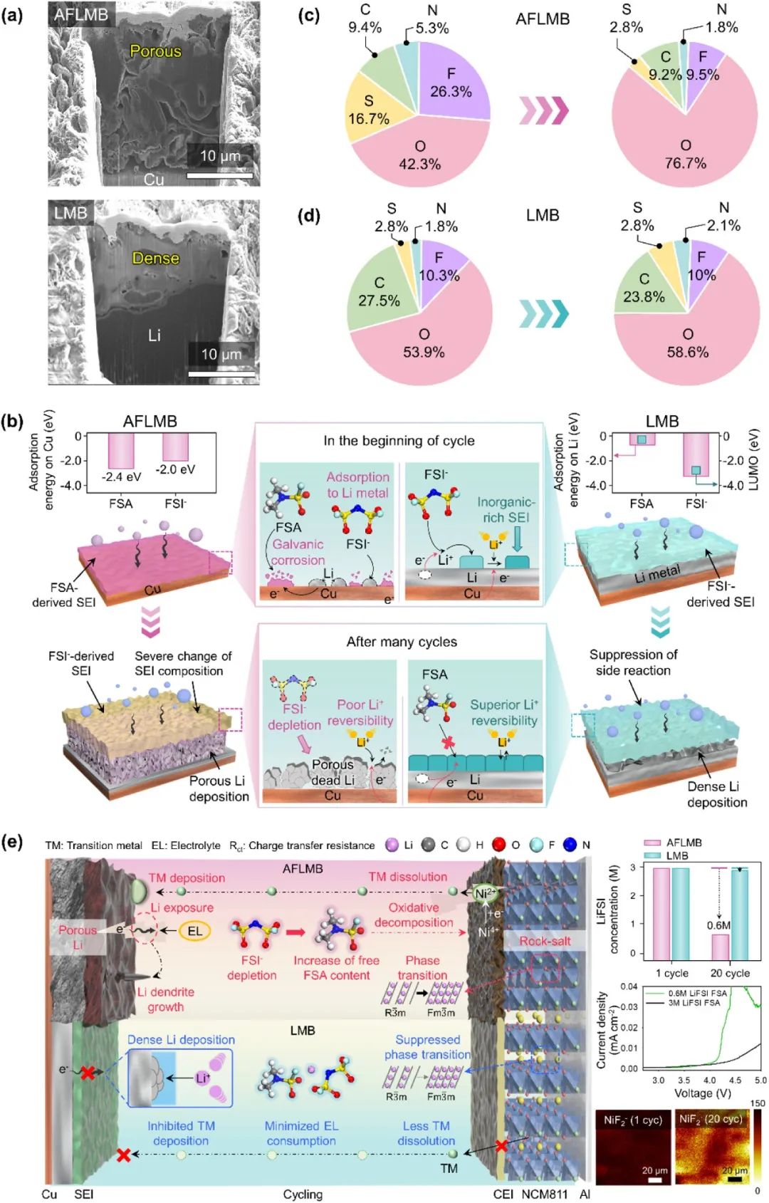 陰離子在 Cu 和鋰金屬上的吸附傾向的結(jié)果,Cu 銅箔和鋰金屬陽極在第一個(gè)周期鍍鋰前后 SEI 成分的變化示意圖。XPS 分析得出的原子百分比:(c) AFLMB 中的銅箔和 (d) LMB 中的鋰金屬陽極,在 AFLMB 首次充電期間,鍍鋰前充電至 3.7 V 和鍍鋰后充電至 4.25 V 時(shí)的對比。(e)通過比較分析(循環(huán)過程中 LiFSI 濃度的變化、LSV 和 TOF-SIMS 圖像)發(fā)現(xiàn),使用 3 M LiFSI FSA 電解液的 AFLMB 和 LMB 的界面現(xiàn)象存在差異。