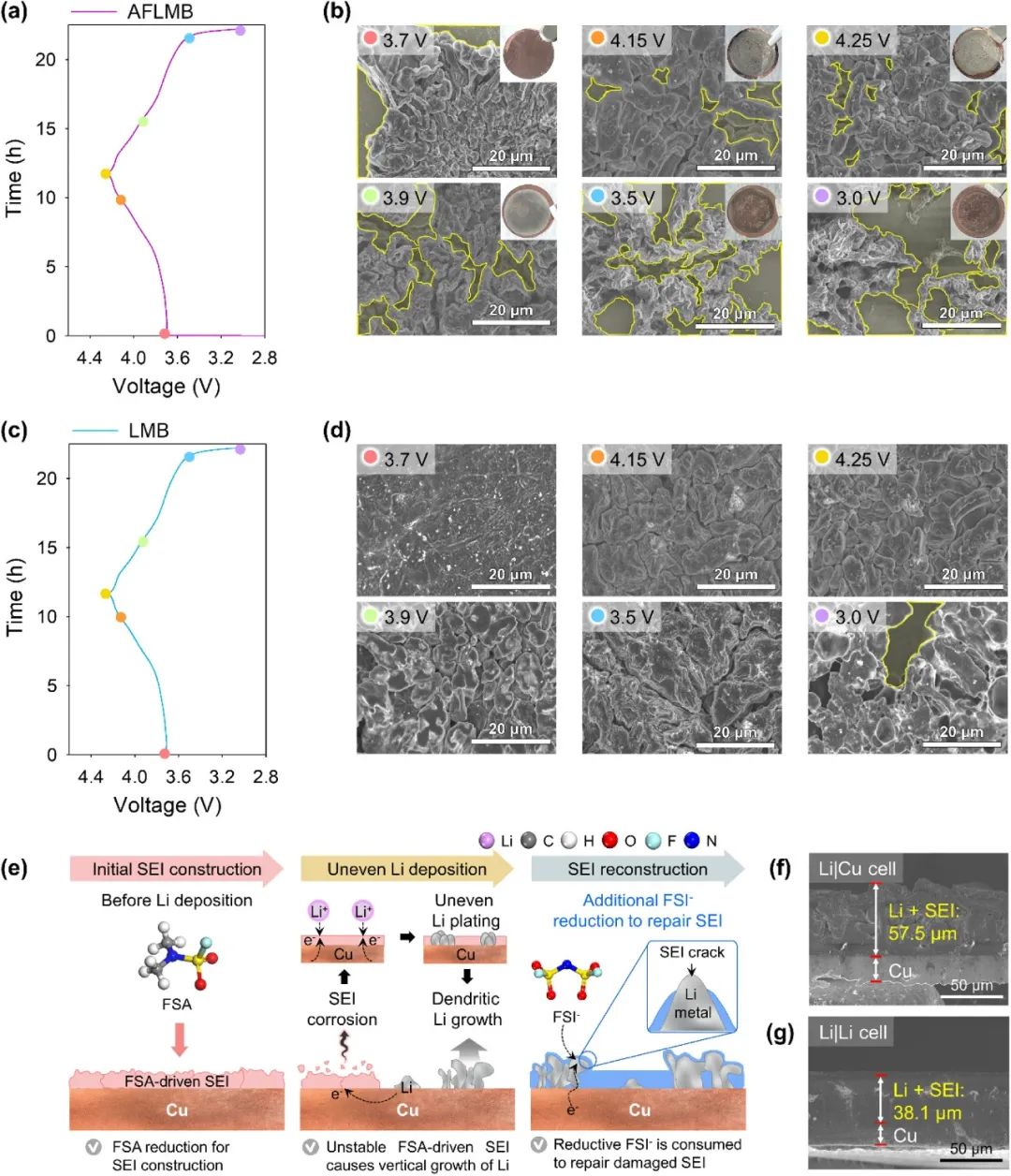 在預(yù)循環(huán)充電過程中,銅基底表面的鋰沉積呈現(xiàn)不均勻現(xiàn)象,即使在4.25 V充電時(shí)也未能完全覆蓋銅箔,而在放電過程中鋰的剝離同樣不均勻,形成樹枝狀形貌(圖5a、b)。相比之下,鋰金屬陽極的SEI則確保了鋰沉積的均勻性(圖5c、d)。在3.0 V放電時(shí)的形態(tài),發(fā)現(xiàn)LMB中的SEI產(chǎn)生的樹枝狀形態(tài)較少。為探討SEI與鋰金屬接觸時(shí)的穩(wěn)定性,將AFLMB和LMB在室溫下存放4天。結(jié)果顯示,與LMB相比,AFLMB中由FSA驅(qū)動(dòng)的SEI阻抗迅速增加,這歸因于鋰沉積過程中SEI的成分變化以及電化學(xué)腐蝕導(dǎo)致的SEI重建。此外,暴露的銅表面可能導(dǎo)致樹枝狀鋰沉積(圖5e)。對比鋰/銅電池與鋰/鋰電池中鋰沉積的厚度,鋰/鋰電池上的鋰沉積層表現(xiàn)為薄而致密,幾乎無明顯空隙(見圖5f),而鋰/銅電池上的鋰沉積層則顯得厚而不致密(見圖5g)。