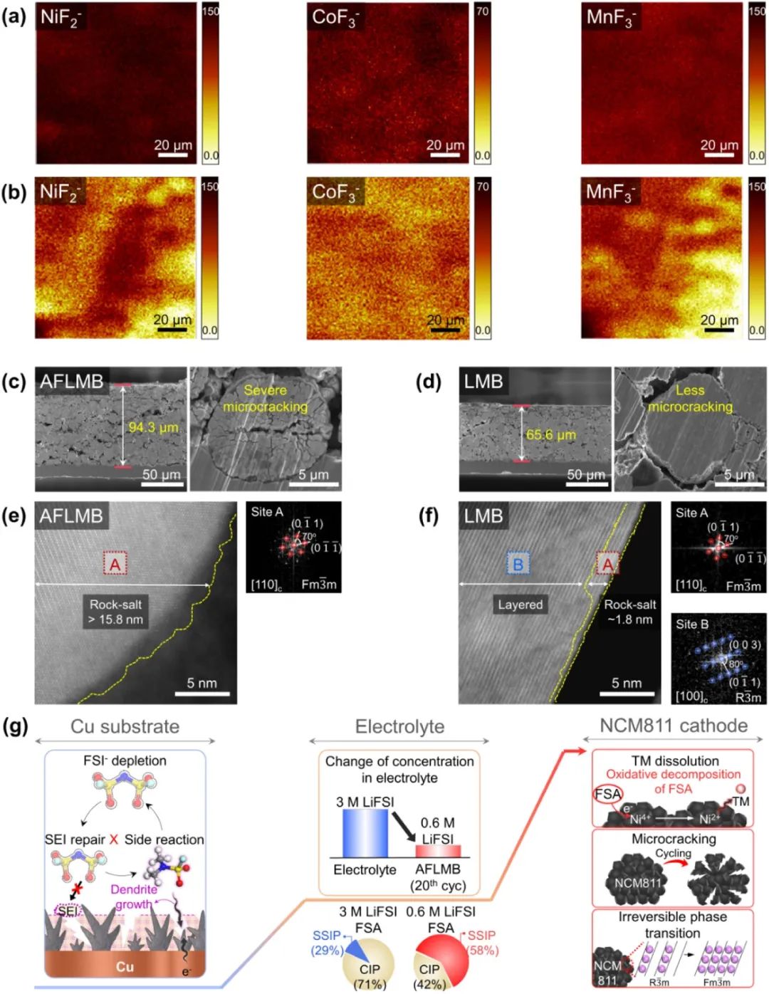 的 TOF-SIMS 化學(xué)圖譜。在 C/3 和 25 °C 下循環(huán) 100 次后,從 (c) AFLMB 和 (d) LMB 中提取的 NCM811 陰極的截面 SEM 圖像。在 C/3 和 25 °C 下循環(huán) 100 次后,從含有 3 M LiFSI FSA 電解液的 (e) AFLMB 和 (f) LMB 中提取的 NCM811 陰極的 STEM 圖像和 FFT 圖樣。(g) FSI 陰離子耗竭和 SEI 降解對 NCM811 陰極的交叉影響。