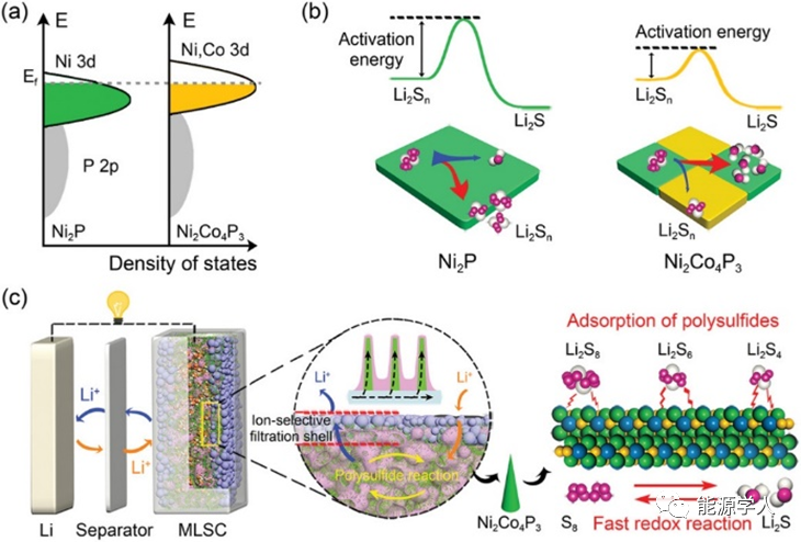 綜上,通過(guò)引入氮空位缺陷,能夠調(diào)控催化劑的電子結(jié)構(gòu),從而改善對(duì)多硫化物的吸附與催化性能。通過(guò)變溫CV測(cè)試,結(jié)合阿倫尼烏斯方程,引入氮空位后的多硫化物轉(zhuǎn)化能壘僅為8.11 kJ mol–1,小于Ni3N的21.11 kJ mol–1。基于該催化劑設(shè)計(jì),在1000圈的長(zhǎng)循環(huán)過(guò)程中,容量衰減僅為每圈0.039%,即使在5.2 mg cm–2的高負(fù)載下,依然可以穩(wěn)定循環(huán)100圈。該文章結(jié)合實(shí)驗(yàn)與理論計(jì)算,揭示了催化劑電子結(jié)構(gòu)與吸附和催化性能之間的內(nèi)在聯(lián)系,對(duì)于進(jìn)一步設(shè)計(jì)高活性鋰硫催化劑具有重要的意義。 Zihan Shen, Zili Zhang, Matthew Li, Yifei Yuan, Yue Zhao, Shuo Zhang, Chenglin Zhong, Jia Zhu, Jun Lu*, and Huigang Zhang*, Rational design of a Ni3N0.85 electrocatalyst to accelerate polysulfide conversion in lithium-sulfur batteries, ACS nano, 2020, DOI:10.1021/acsnano.9b09371Zihan Shen, Mengqiu Cao, Zili Zhang, Jun Pu, Chenglin Zhong, Jiachen Li, Haixia Ma, Fujun Li, Jia Zhu, Feng Pan, Huigang Zhang, Efficient Ni2Co4P3 Nanowires Catalysts Enhance Ultrahigh‐Loading Lithium–Sulfur Conversion in a Microreactor‐Like Battery, Advanced Functional Materials, 2019, 30(3), 1906661 , DOI: 10.1002/adfm.201906661